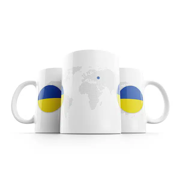 Origineel ontworpen Oekraïense vlag mok met een wereldmap en een locatiepunt van Oekraïne. Het ontwerp is aan beide kanten van de mok bedrukt, dus het maakt niet uit hoe je de mok vast hebt. Leuk om weg te geven als cadeau.